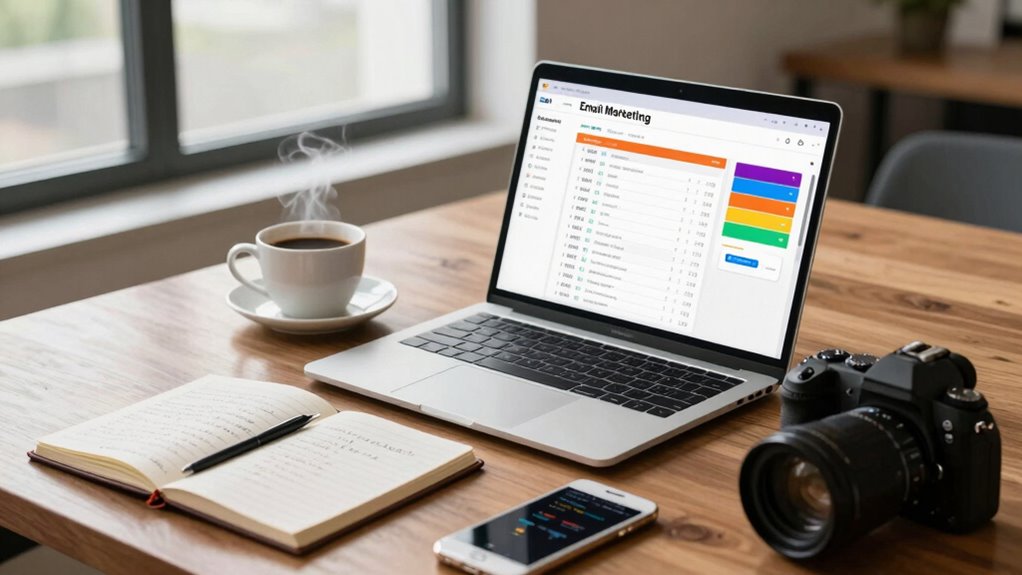 Maintaining a consistent brand identity across your email marketing efforts is essential for building trust and recognition with your audience. To do this, focus on unified messaging that reflects your brand storytelling and visual branding. Guarantee your tone, style, and visuals align with your overall brand personality. Consistency reinforces your credibility and helps your audience connect more deeply with your brand.