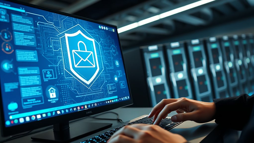 Top email providers protect your data with advanced security measures like encryption protocols, including TLS and end-to-end encryption, to keep your messages confidential. They also use sophisticated phishing detection systems that flag suspicious links and fake sender addresses, preventing malicious attacks before they reach your inbox. Regular security updates, multi-factor authentication, and activity monitoring further strengthen your account safety. Keep exploring to discover more ways these services guard your online communication effectively.