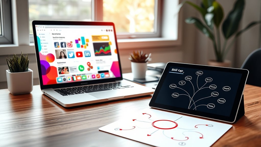 To shift from social media to email marketing, focus on developing skills in audience segmentation, personalization, and automation. You’ll need to craft targeted content, optimize calls to action, and analyze key metrics to improve performance. Familiarize yourself with email platforms and guarantee compliance with regulations. Building these capabilities takes time but mastering them will boost your effectiveness. Keep exploring these areas to uncover practical strategies and best practices that’ll set you up for success.