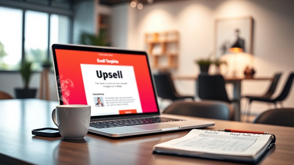 To boost repeat sales, craft personalized upsell emails by segmenting your customers based on preferences and purchase history. Highlight relevant complementary products or upgrades that naturally enhance their original buy. Use a clear, compelling message with strong calls-to-action, emphasizing benefits and urgency. Personalization and targeted offers increase engagement and conversions. If you keep exploring, you’ll discover effective templates to maximize your upsell success and foster customer loyalty.