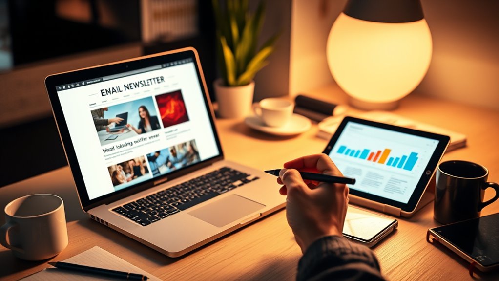 Think of analytics as your compass, guiding your email campaigns like a seasoned sailor. Use audience segmentation to tailor content precisely, boosting engagement. Conduct A/B testing on subject lines and calls-to-action to discover what resonates most. By analyzing open rates, click-throughs, and conversions, you refine your approach, ensuring each campaign outperforms the last. This strategic use of data helps you connect deeper with your subscribers and grow your audience.