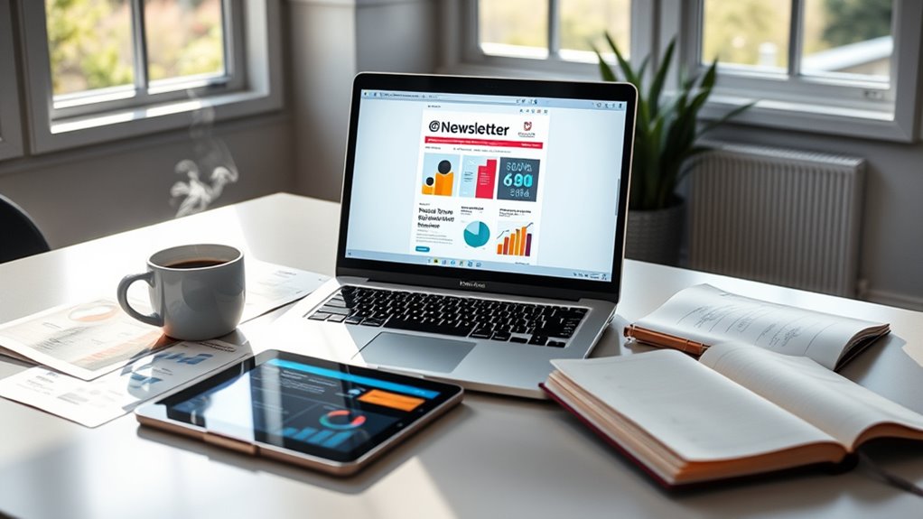 Audience behavior shapes how you should integrate content and email marketing. By analyzing your audience segmentation, you can identify preferences, interests, and engagement patterns. Use these insights to develop personalized strategies that deliver relevant content, increasing open and click-through rates. Tailoring your messaging to what your audience values guarantees your campaigns resonate, fostering stronger engagement and better overall results. Always adapt your approach based on ongoing audience behavior insights.
