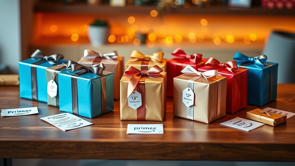 Looking for the best Amazon Prime 3-month gift subscriptions? I recommend options like Prime memberships, which offer fast delivery and streaming perks, and fun add-ons such as game codes or personalized gift cards. These gifts are versatile and perfect for friends or family who love convenience and entertainment. Curious about the top choices? Keep exploring, and you’ll find plenty of thoughtful ideas to make your present stand out.