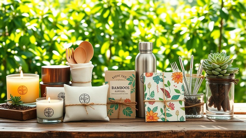 Imagine a palette of nature’s finest: bamboo, recycled metals, organic cotton, and biodegradable plastics. These materials are the backbone of sustainable gifts, blending eco-consciousness with durability. Bamboo, like nature’s fast-growing magic wand, lends itself to everything from utensils to clothing. Recycled metals transform old into new treasures, while organic cotton offers softness without harming the planet. I love how these materials turn everyday items into meaningful, earth-loving gifts.