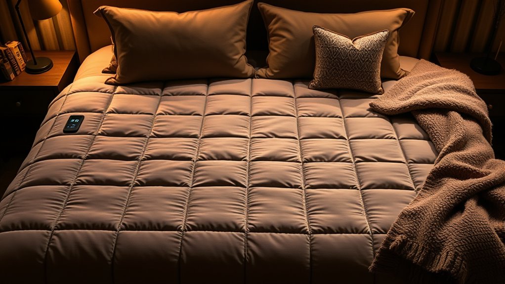 When choosing a king size dual control electric blanket, considering energy efficiency is essential to save on power bills and reduce environmental impact. I look for blankets with adjustable temperature settings so I can customize warmth without wasting energy. Models with automatic shut-off timers are a must, ensuring the blanket turns off after a set time, preventing unnecessary power use. I also favor blankets with rapid-heat technology, which heats up quickly, reducing energy waste by reaching the desired temperature faster. Energy-efficient heating wires that maintain consistent warmth without drawing excess power are another key feature. Ultimately, I check for energy-saving certifications or features that indicate lower consumption during use, helping me stay warm and eco-conscious simultaneously.