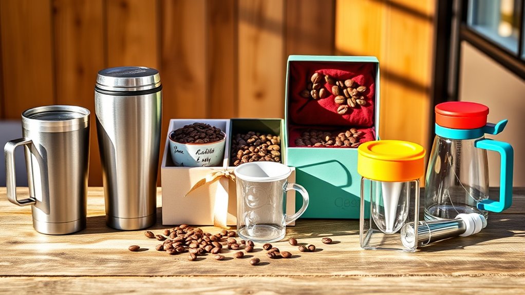 To pick eco-friendly coffee gifts, I focus on sustainable materials, like reusable mugs or biodegradable filters. I also look for certifications such as Fair Trade or Organic, which guarantee ethical sourcing. Supporting local roasters or brands committed to environmental responsibility is a plus. I avoid plastic packaging and opt for items that can be reused or recycled, making my gift thoughtful for both the recipient and the planet.