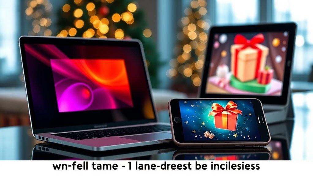 If you need last-minute digital gifts that make an instant impact, I suggest opt for personalized e-gift cards or subscriptions, which are easy to send and impress with a thoughtful touch. Another great choice is custom digital greeting cards with sound or video messages, adding a personal and memorable element. Finally, countdown clocks or digital timers can create excitement and anticipation for upcoming events. Keep exploring to discover more about choosing the perfect last-minute digital gift.