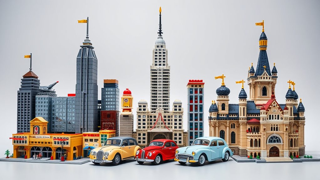 If you’re looking to elevate your LEGO collection in 2025, I recommend focusing on sets that match your skill level, like the detailed LEGO Architecture London Skyline or Paris models, which boost architectural accuracy and educational value. Themes that resonate with your interests, whether art, nature, or gaming like the Game Boy set, keep building fun and meaningful. Don’t forget to take into account your space for display and choose challenging yet rewarding sets. Keep going—you’ll discover even more amazing options that fit your style.