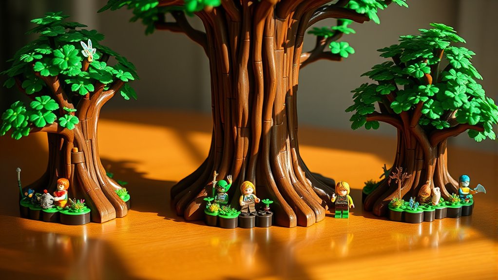 The build complexity level of the Lego Zelda Great Deku Tree set directly impacts how challenging and time-consuming the assembly process will be. Sets range from simple builds suitable for beginners to highly intricate models for experienced builders. Higher complexity sets usually include more pieces and detailed instructions, demanding advanced skills and patience. If you’re new to Lego or building with young children, opting for a lower complexity set guarantees a fun, frustration-free experience. On the other hand, more complex models can take several hours or multiple sessions to complete, providing a satisfying challenge for dedicated enthusiasts. Understanding the complexity level helps you select a set that matches your skill, patience, and how much time you want to invest in the build.