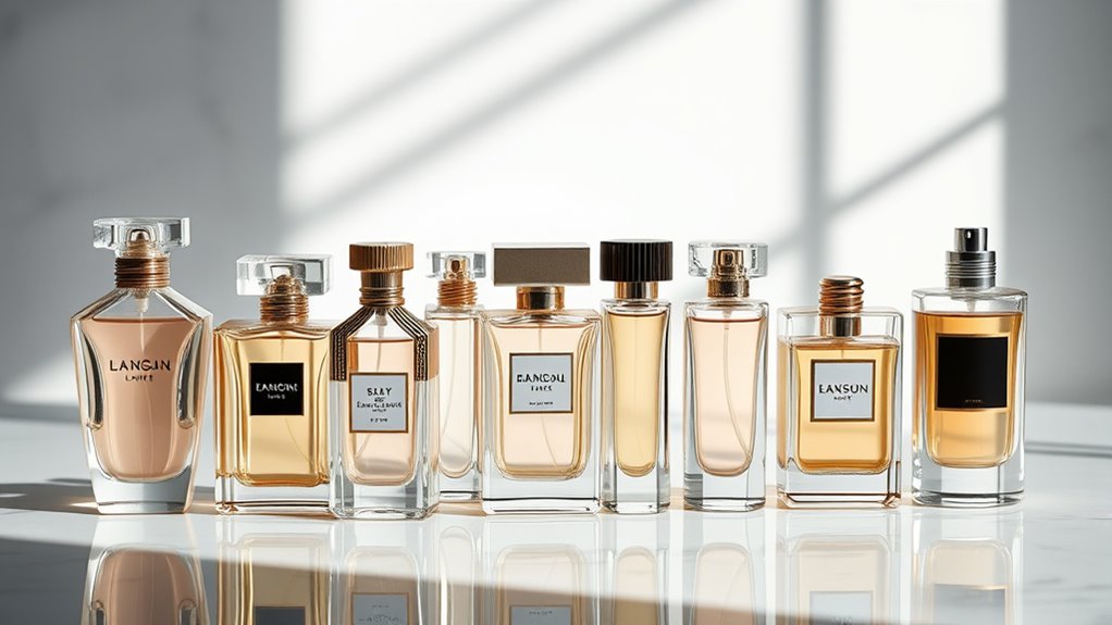 Choosing the right perfume involves more than just the scent; packaging and presentation play a crucial role in your overall experience. Elegant packaging can boost the perfume’s perceived value and make it a stunning gift. The bottle’s design and materials often reflect the fragrance’s personality, influencing buying decisions. Travel-sized bottles add convenience for on-the-go use and frequent reapplication, making them perfect for busy lifestyles. Clear labeling with detailed scent profiles helps you select perfumes that match your preferences and mood. Additionally, eco-friendly and sustainable packaging options appeal to environmentally conscious shoppers, making your choice more meaningful. Overall, thoughtful packaging not only enhances aesthetic appeal but also aligns with your values, elevating your entire perfume experience.