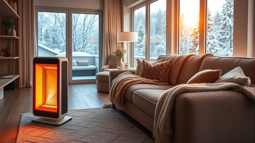 Ever wonder how quickly a space heater can warm up a large room? Heating speed efficiency plays a vital role in comfort and energy savings. Heaters with higher wattage, like 1500W or more, typically warm a space faster than lower-power models. Features such as dual heating elements or advanced thermal designs boost heat output, accelerating the warming process. Wide-angle oscillation helps distribute heat evenly across the room, speeding up overall warmth. An adjustable thermostat allows you to set the desired temperature precisely, letting the heater reach that point quickly and maintain it effectively. When choosing a heater, consider these factors to guarantee rapid heating, so your large room warms up promptly, saving energy and keeping you cozy without long waits.