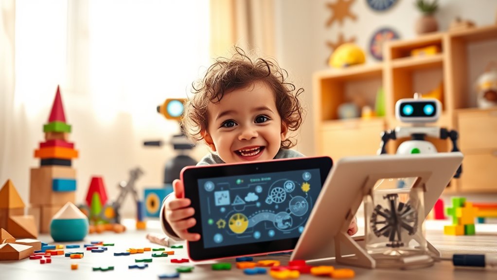 Have you ever wondered how STEM toys can boost your toddler’s early learning? These toys are designed to develop essential cognitive skills like problem-solving, reasoning, and understanding scientific concepts. When choosing, look for age-appropriate options that introduce foundational skills such as fine motor coordination, spatial awareness, and basic engineering principles. Hands-on experimentation and exploration are key, as they encourage active engagement and experiential learning. Toys that feature clear instructions promote independent discovery and spark curiosity about how things work. Additionally, prioritize high-quality options made from safe, non-toxic materials. This guarantees a secure environment for your child’s development while making learning fun. Ultimately, the right STEM toy should stimulate their mind and foster a love for learning through meaningful, educational play.