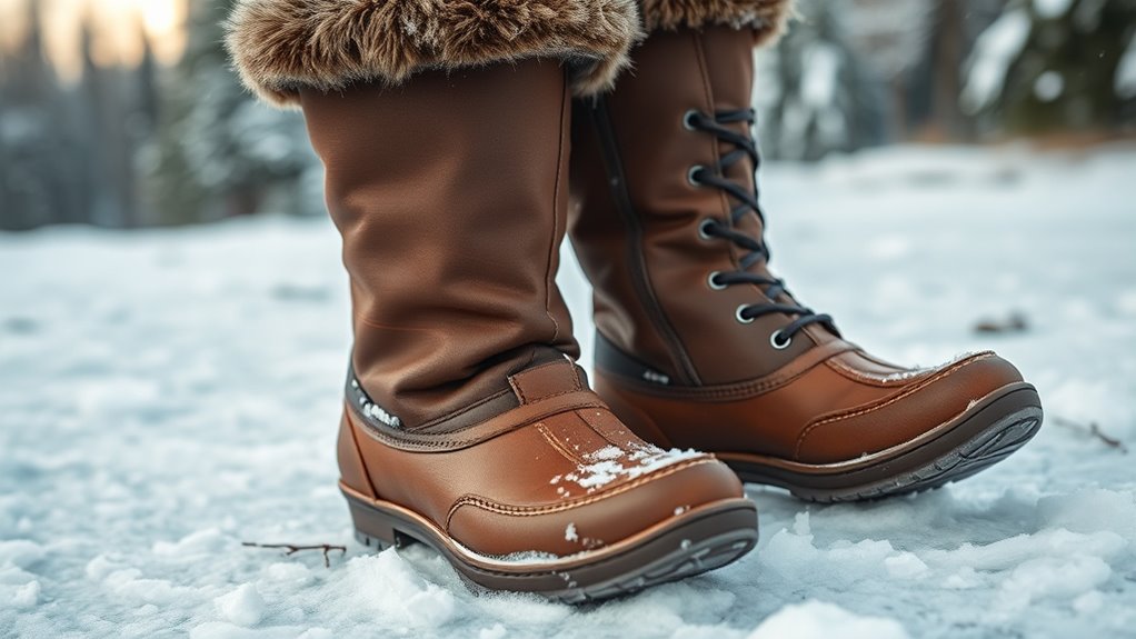 Insulation and warmth level are crucial factors to contemplate because they directly influence how comfortable and protected your feet will be in cold weather. The insulation inside the boots, like faux fur lining or Thinsulate, determines how well your feet retain heat. Thicker insulation, such as 400g, generally offers more warmth but can reduce flexibility and breathability, so it’s essential to match insulation weight to your winter conditions. The insulation rating, measured in grams, indicates the amount of thermal material—higher numbers mean more warmth. Proper insulation also prevents heat loss and moisture buildup, keeping your feet dry and comfortable. Ultimately, choosing the right insulation type and thickness ensures your boots keep you warm without sacrificing comfort during snowy, chilly days.
