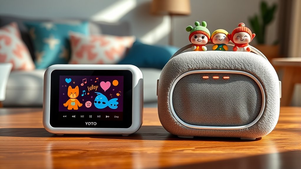 In my opinion, both the Yoto Player and Toniebox are fantastic options for screen-free entertainment, but they serve different needs. The Yoto offers a vast library, customization, and detailed parental controls, ideal for older kids and long-term use. The Toniebox is super durable, simple to operate with figurines, perfect for younger children. To find out which one suits your child best and discover the latest features, keep exploring these popular options.